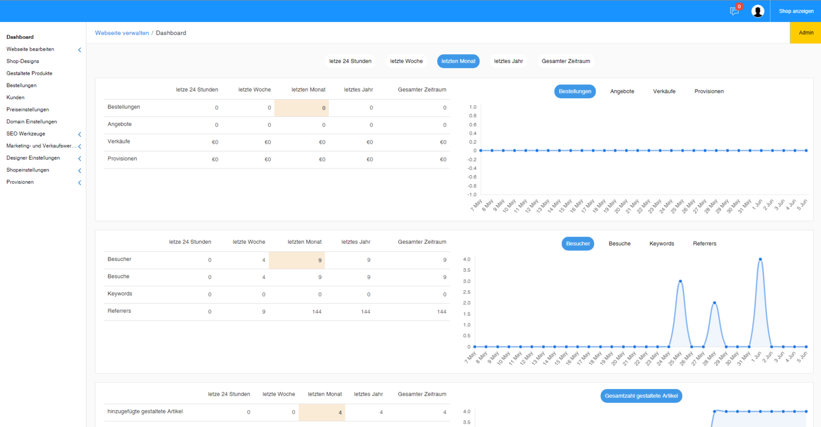 Neben einer ausführlichen Statistik über Bestellungen, Anbebote und Verkäufe haben Sie hier direkt die von Ihnen erwirtschafteten Provisionen im Blick. Einfache Quick-Links erleichtern Ihnen außerdem den Start zum Einrichten Ihres eigenen Shops.