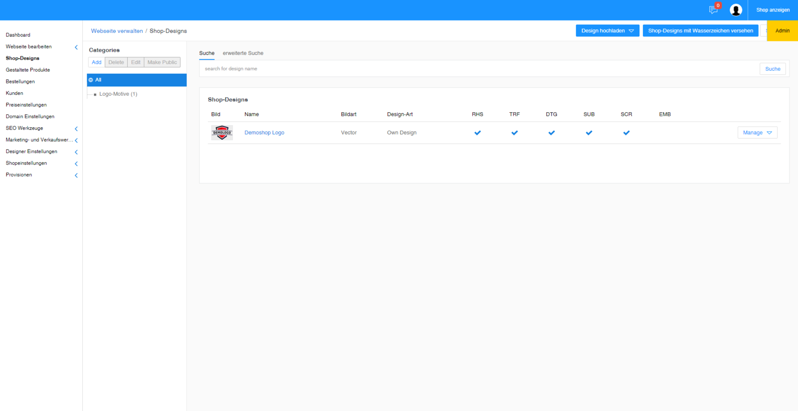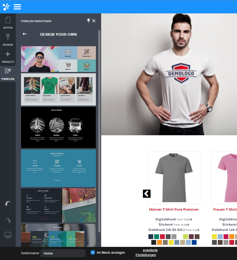 Unsere Resellershops sind straight forward. Laden Sie einfach Ihre fertigen Motive für ihren Resellershop im Backend unter Shop-Designs hoch um sie anschließend für die Gestaltung zur Verfügung zu haben.